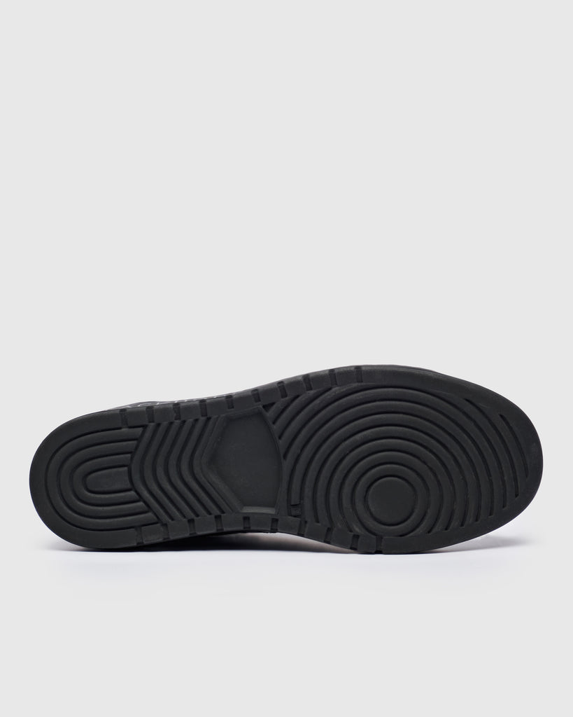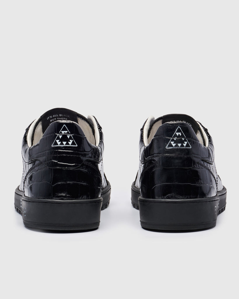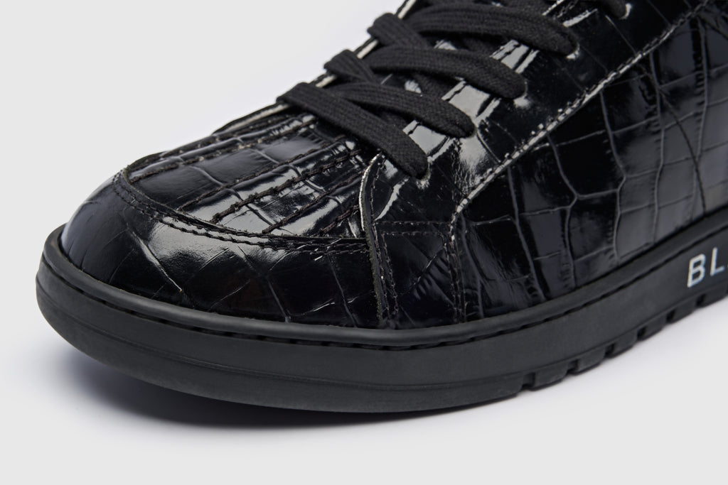Questa scarpa da ginnastica, realizzata in pelle di alta qualità con una distintiva stampa coccodrillo, reinterpreta il classico stile da tennis degli anni '80 con un tocco moderno e lussuoso. Il design completamente nero, dalle tomaie alla suola, trasmette un'eleganza raffinata e un carattere deciso.